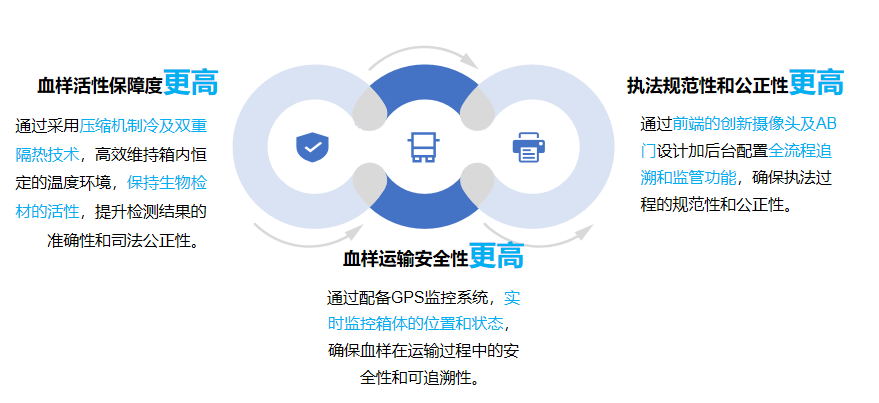 ⑥ 独有AB门创新设计:AB门创新设计,保障已存放血样的安全性,提升执法的规范性。
